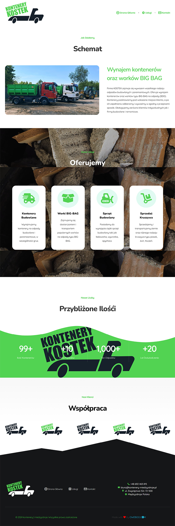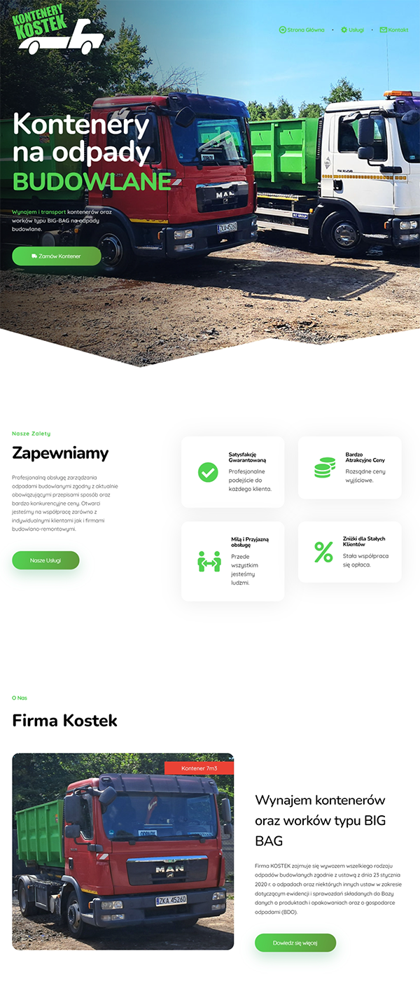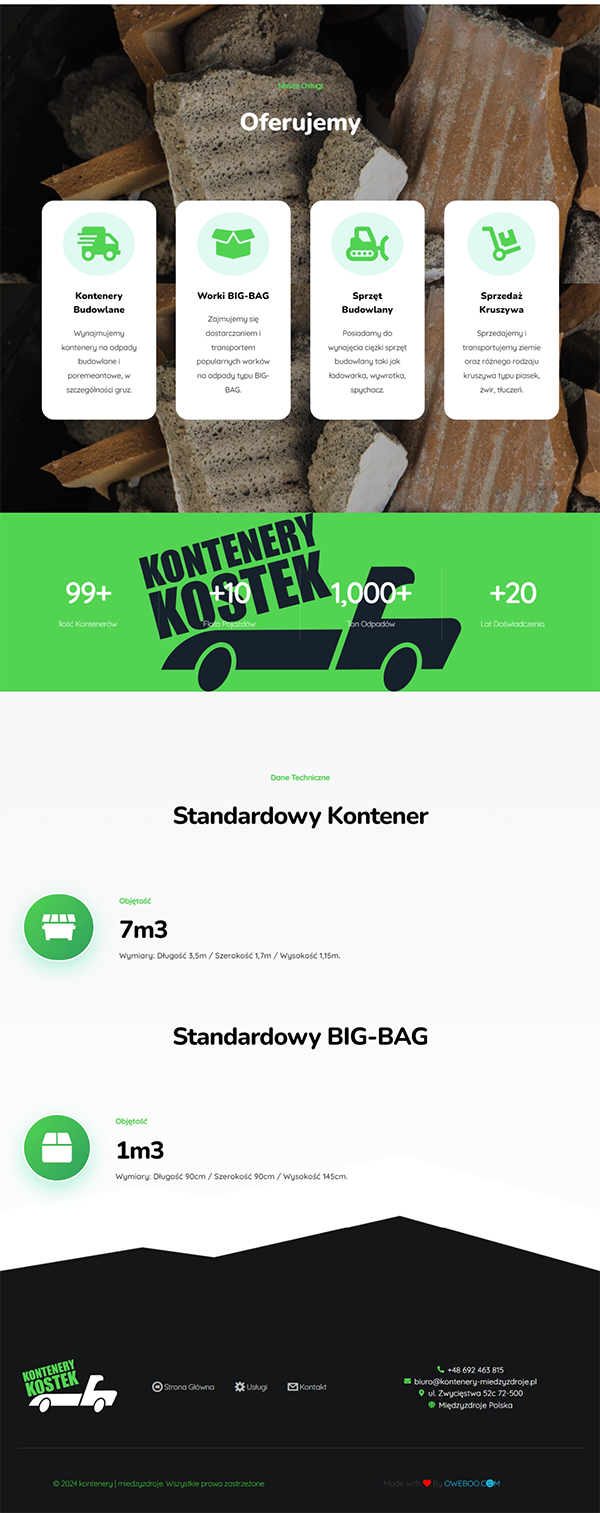 The website offers rental of construction waste containers and BIG-BAG bags. The company also deals with the transport of construction waste, the sale and transport of aggregates, and the rental of construction equipment. The "Kostek" company provides professional service, competitive prices, and discounts for regular customers. The headquarters is located in Międzyzdroje. More information can be found at: [kontenery-miedzyzdroje.pl]Po Polsku